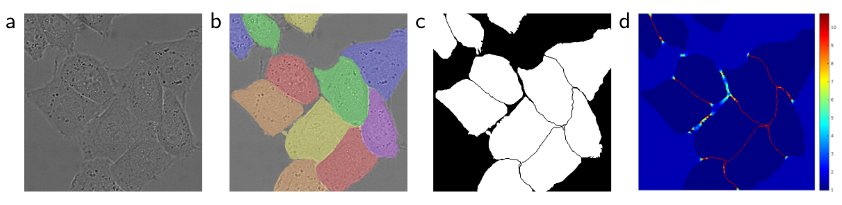 - Weight map 은 border 를 잘 구분해 cell segmentation 하도록 학습에 관여합니다. ( Figure 3 참고 ) $$ w\left ( x \right ) = w_{c}\left ( x \right ) + w_{0} \bullet exp\left ( -\frac{\left ( d_{1}\left ( x \right )+ d_{2}\left ( x \right )\right )^{2}}{2{\sigma }^{2}} \right ) $$